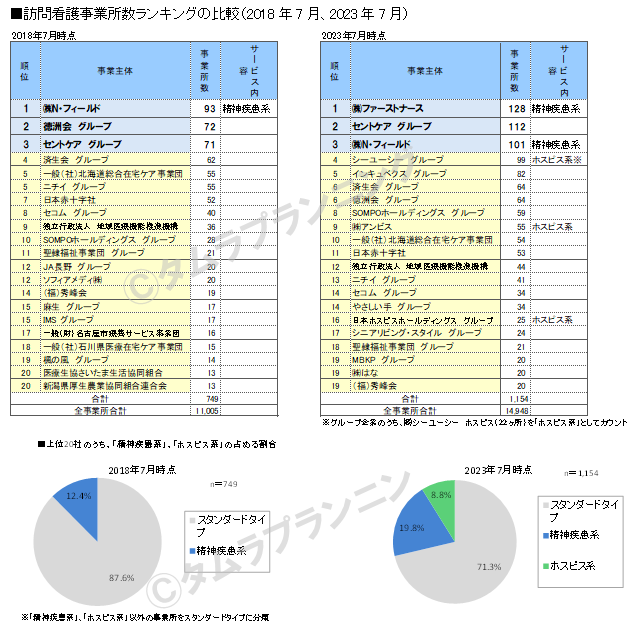 この中で「精神疾患系」(精神疾患系の利用者に特化した訪問看護を運営するオペレーター)及び「ホスピス系」(がん末期等の医療依存度の高い利用者が入居対象となる「住宅型有料老人ホーム」や「サービス付き高齢者向け住宅」を運営するオペレーター)オペレーターの上位進出が目立っており、2018年7月時点では、「精神疾患系」の㈱N・フィールド1社のみであったのに対し、2023年7月時点では、「精神疾患系」の㈱ファーストナース(1位)、「ホスピス系」のシーユーシー グループ(4位)、㈱アンビス(9位)、日本ホスピスホールディングス グループ(16位)と従来のスタンダードな訪問看護とは異なるタイプのオペレーターがランキング上位に進出している。