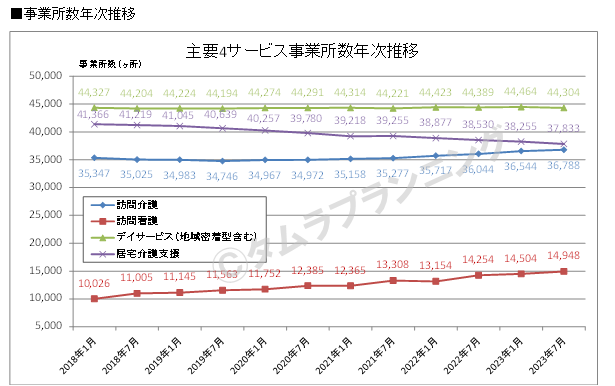 訪問介護、訪問看護の増加傾向続く一方、居宅介護支援の減少傾向が鮮明に