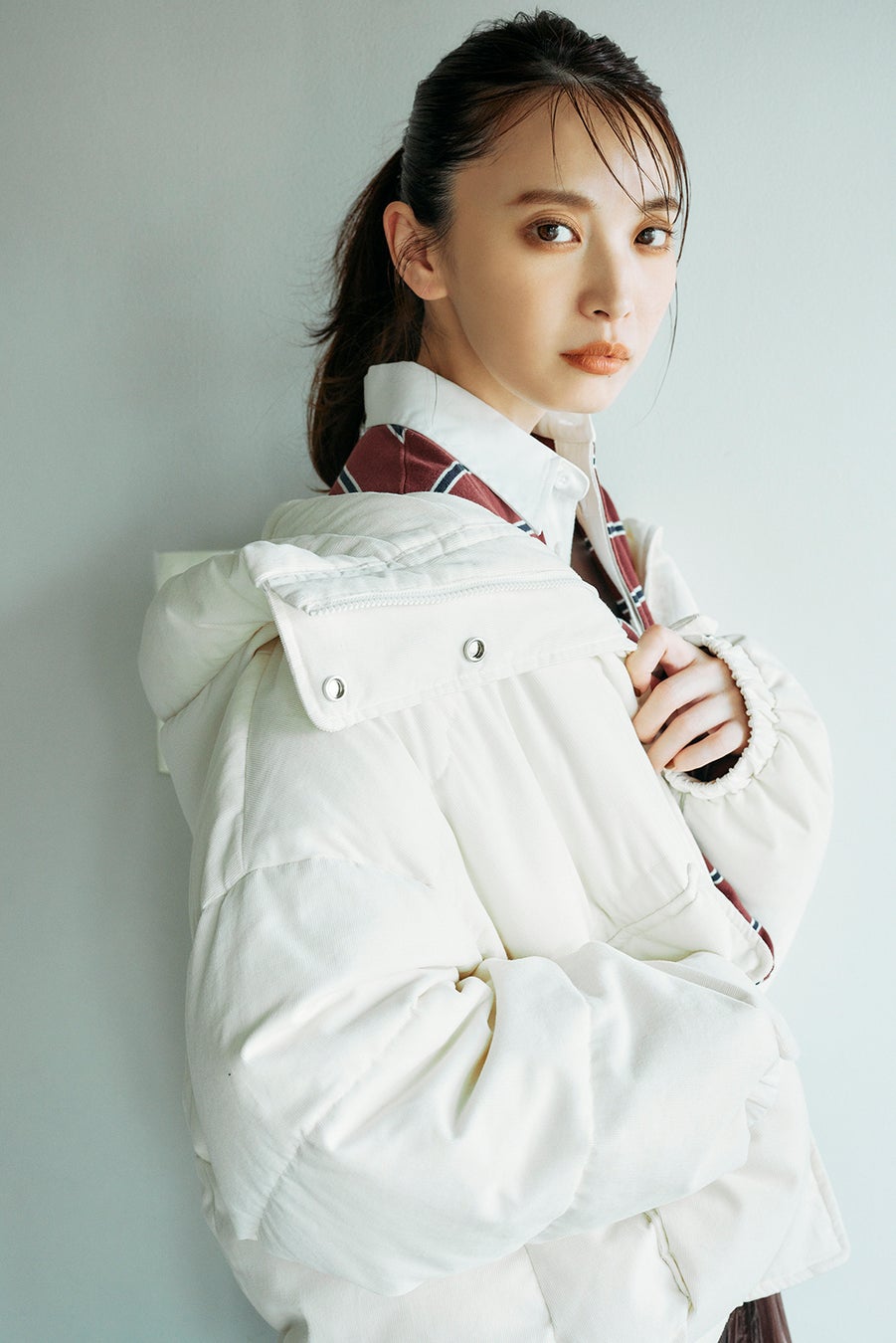 DOWN COAT ¥30,800 / TOPS ¥10,780 / SKIRT ¥12,100