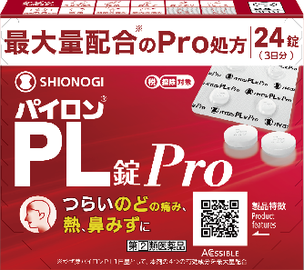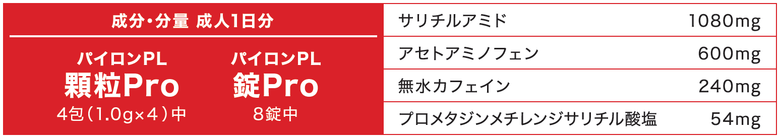 「パイロンPL錠Pro」は、痛みをおさえ熱を下げるサリチルアミドとアセトアミノフェン、痛みをおさえるはたらきを助ける無水カフェイン、鼻みず・鼻づまり・くしゃみをおさえるプロメタジンメチレンジサリチル酸塩の4つの有効成分を最大量※2配合した錠剤タイプのかぜ薬です。1回2錠、1日4回服用です。