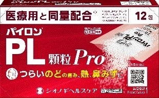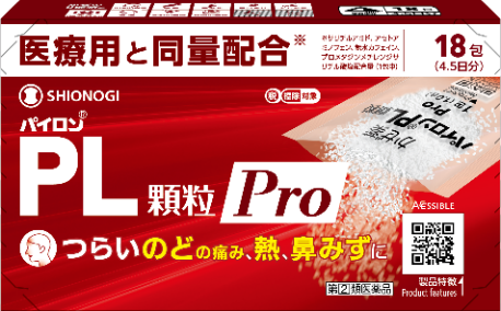 「パイロンPL顆粒Pro」は、痛みをおさえ熱を下げるサリチルアミドとアセトアミノフェン、痛みをおさえるはたらきを助ける無水カフェイン、鼻みず・鼻づまり・くしゃみをおさえるプロメタジンメチレンジサリチル酸塩の4つの有効成分を医療用と同量配合※1した顆粒タイプのかぜ薬です。1回1包、1日4回服用で、持ち運びしやすいSP包装※4を採用しています。
