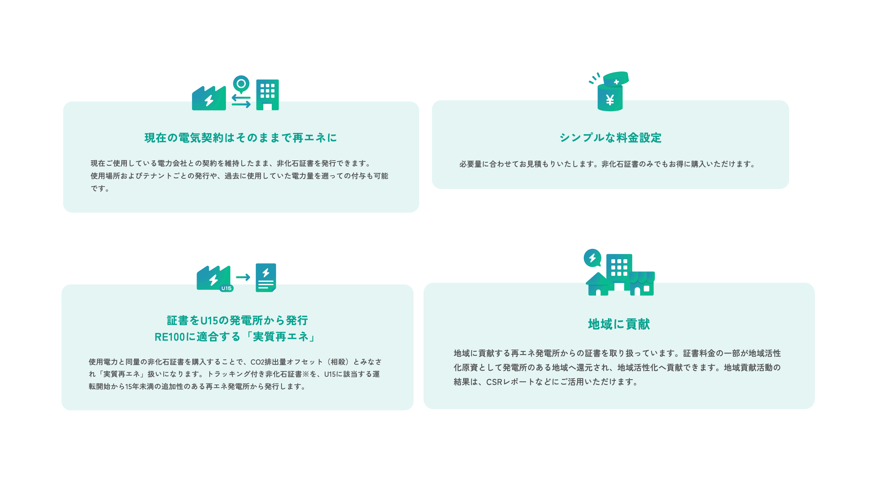 RE 100をはじめ環境問題にまつわる指標や制度は、質の高い取組みを促すため年々難易度が上がる傾向にあります。当社は、高い水準でのESG経営に応えるソリューションとして、 今後とも本質的な社会貢献の仕組みを追求し、再エネ電力取引の新たなスタンダードを牽引して参ります。