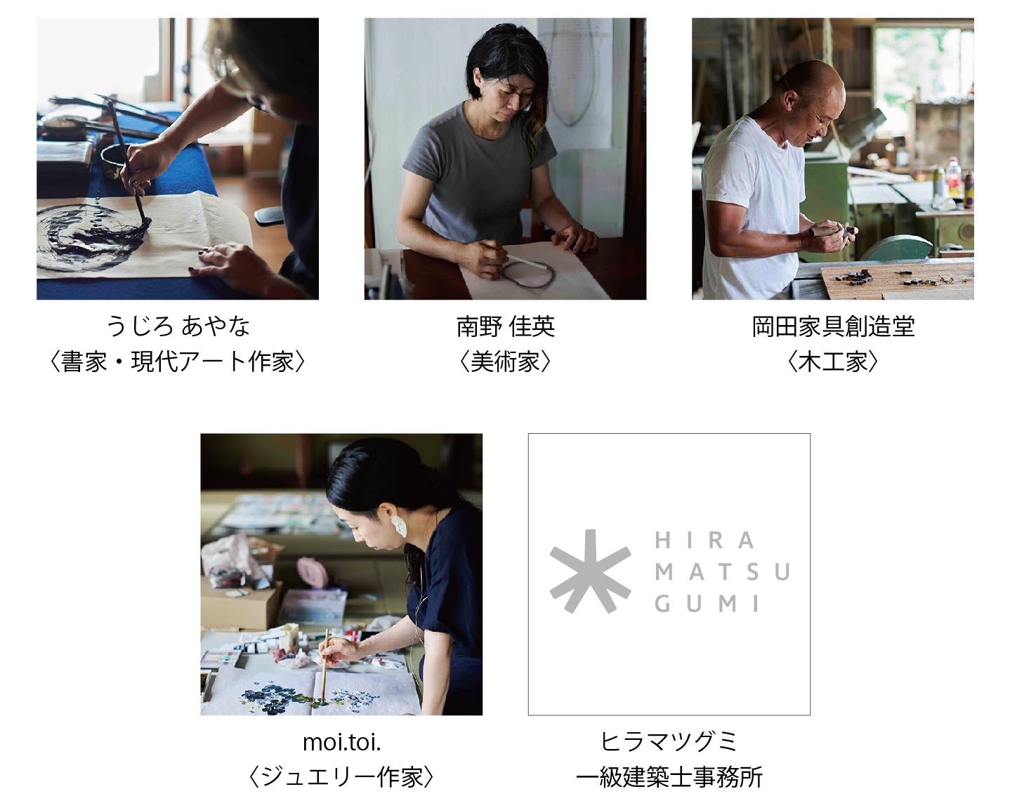淡路島には、その豊かな自然や環境の力を受け、真摯に、伸びやかに制作活動に向き合う作家・アーティストたちがいます。今回は、ヒラマツグミのほか、書家 / 現代アート作家、美術家、木工家、ジュエリー作家という多様な4名の作家に参加いただき、それぞれが、それぞれの視点で見つける「日常の事実」を、さまざまな素材と技法で表現していただきます。