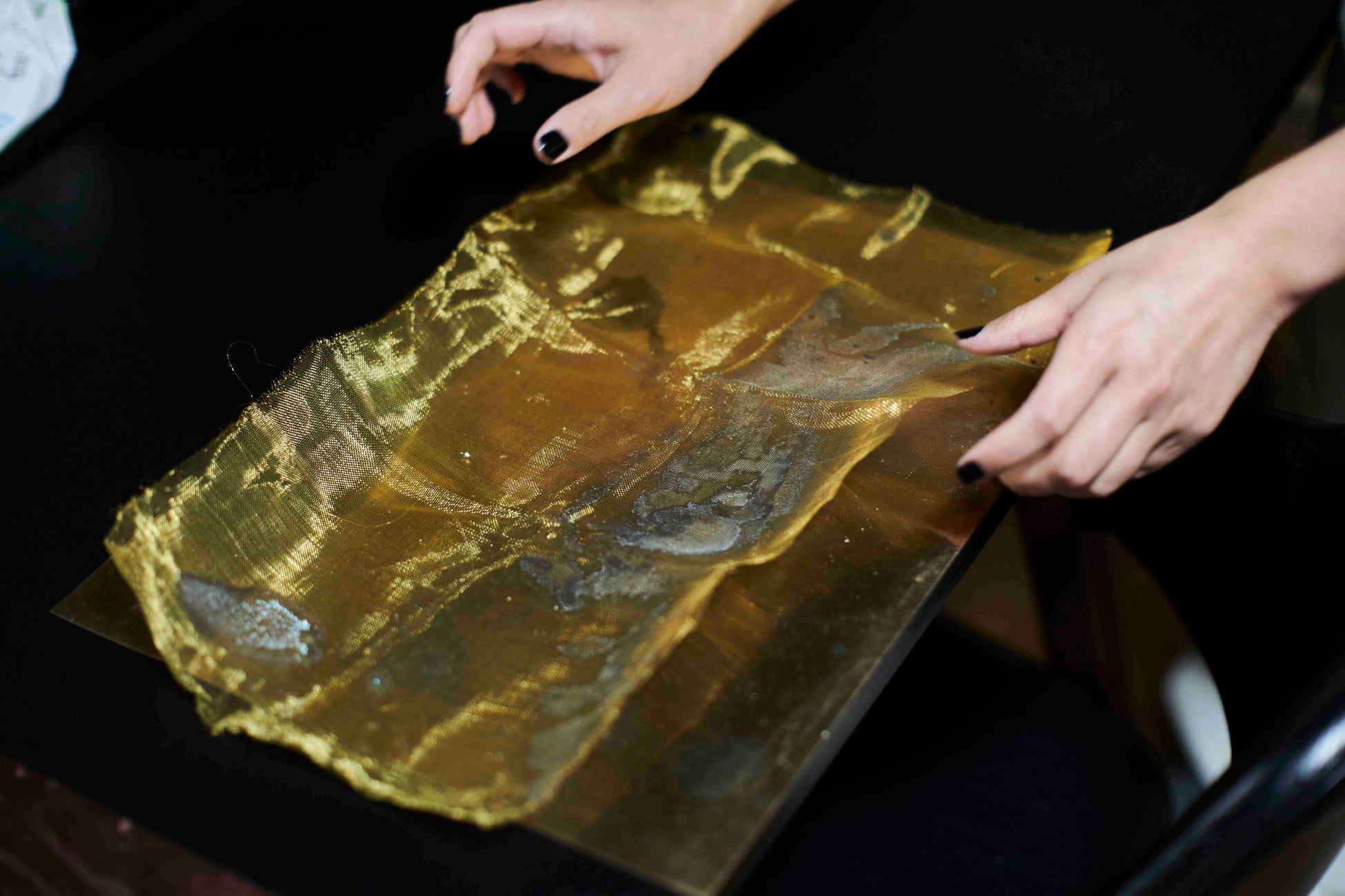 紙と墨で行う書を異素材に置き換える。金属に描かれた書は変化していくことを受け入れる
