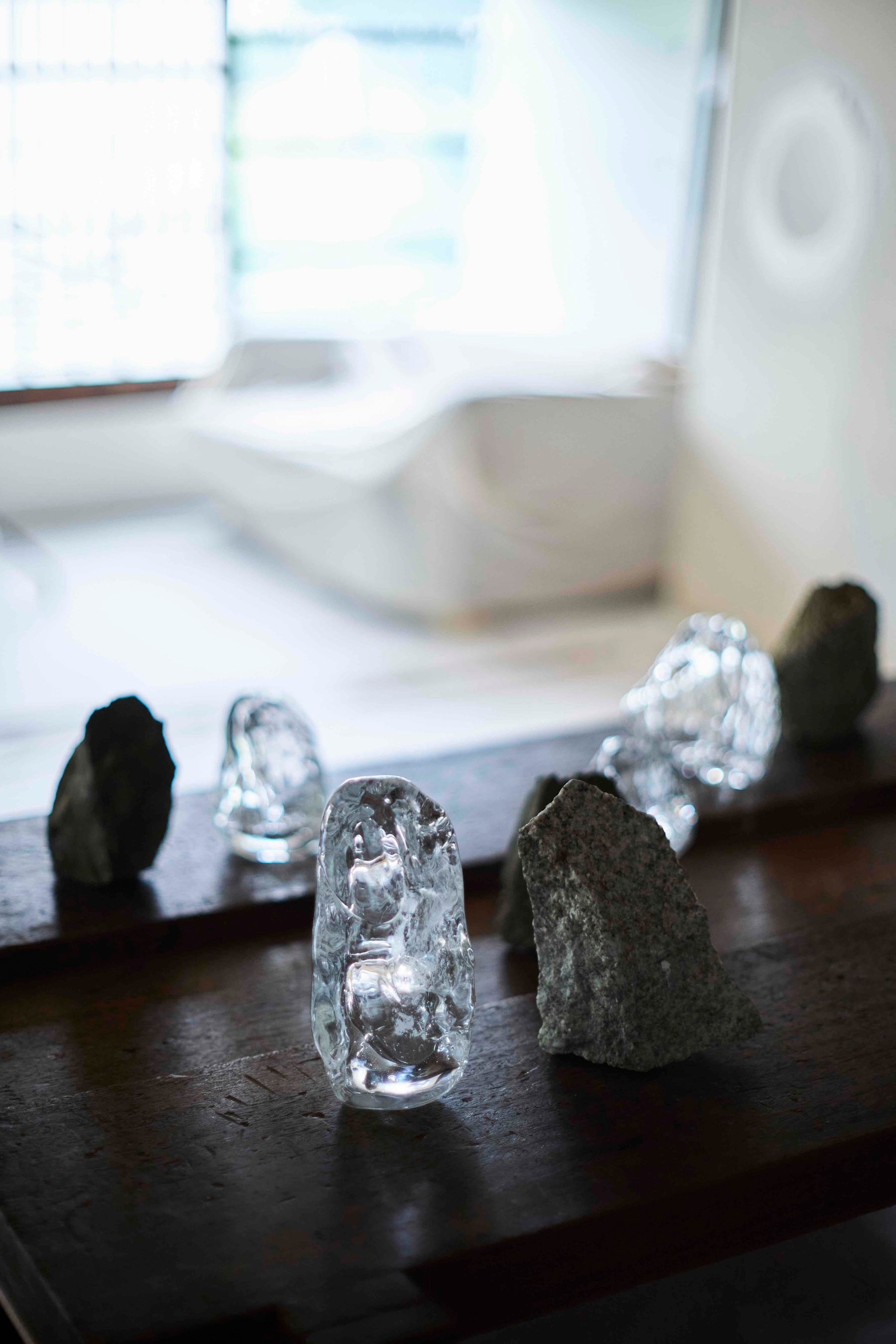 島の様々な場所で採集した石から型をとり、吹きガラスでその形を写し取る