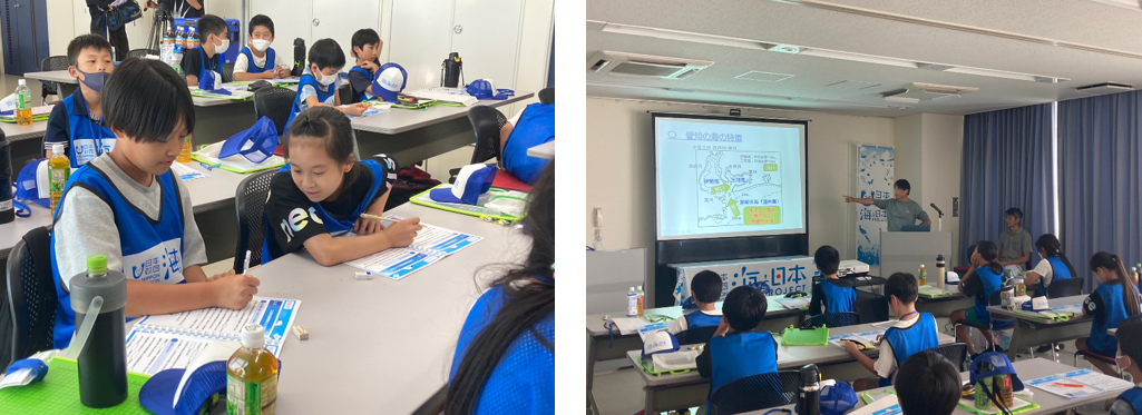 講義を聞きながら、学習ノートの空欄を埋め、三河湾の環境再生に必要な干潟や浅場の働き、藻場の大切さについて学習しました。