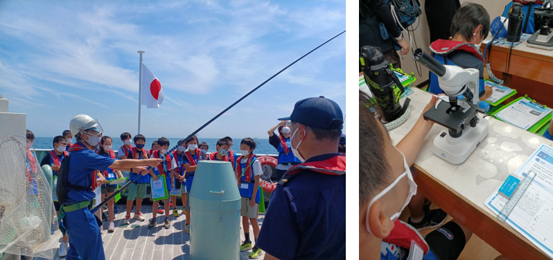 「愛知丸」は普段、高校生の実習船として遠洋漁業の実習なども行っています。そのため大きな実習船なので揺れもなく、空調も完備。カツオの一本釣りのやり方も見せてもらったり、顕微鏡を除いても気分が悪くなることもなく、陸と同じように快適に学習を進めました。