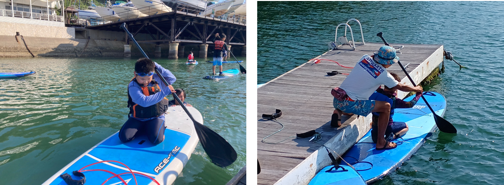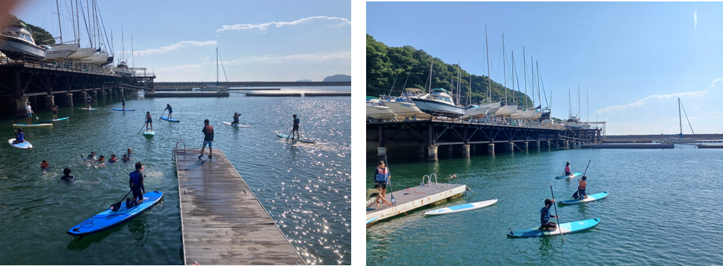 すぐにボードに立ち上がり、水面をスイスイと漕いでいく子どもや、直前で乗るのが怖くなってしまった子もいましたが、仲間たちの励ましで海に入ることが出来たお友達もいました。最後は全員「まだまだやりたい!」「また絶対にSUPをやりたい!」と後ろ髪をひかれながら帰路につきました。