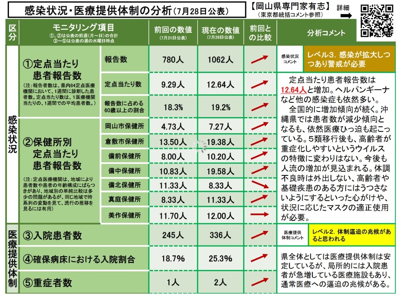 岡山県全体としては医療提供体制は安定していますが、局所的には入院患者が急増している医療施設もあり、通常医療への逼迫の兆候があります。