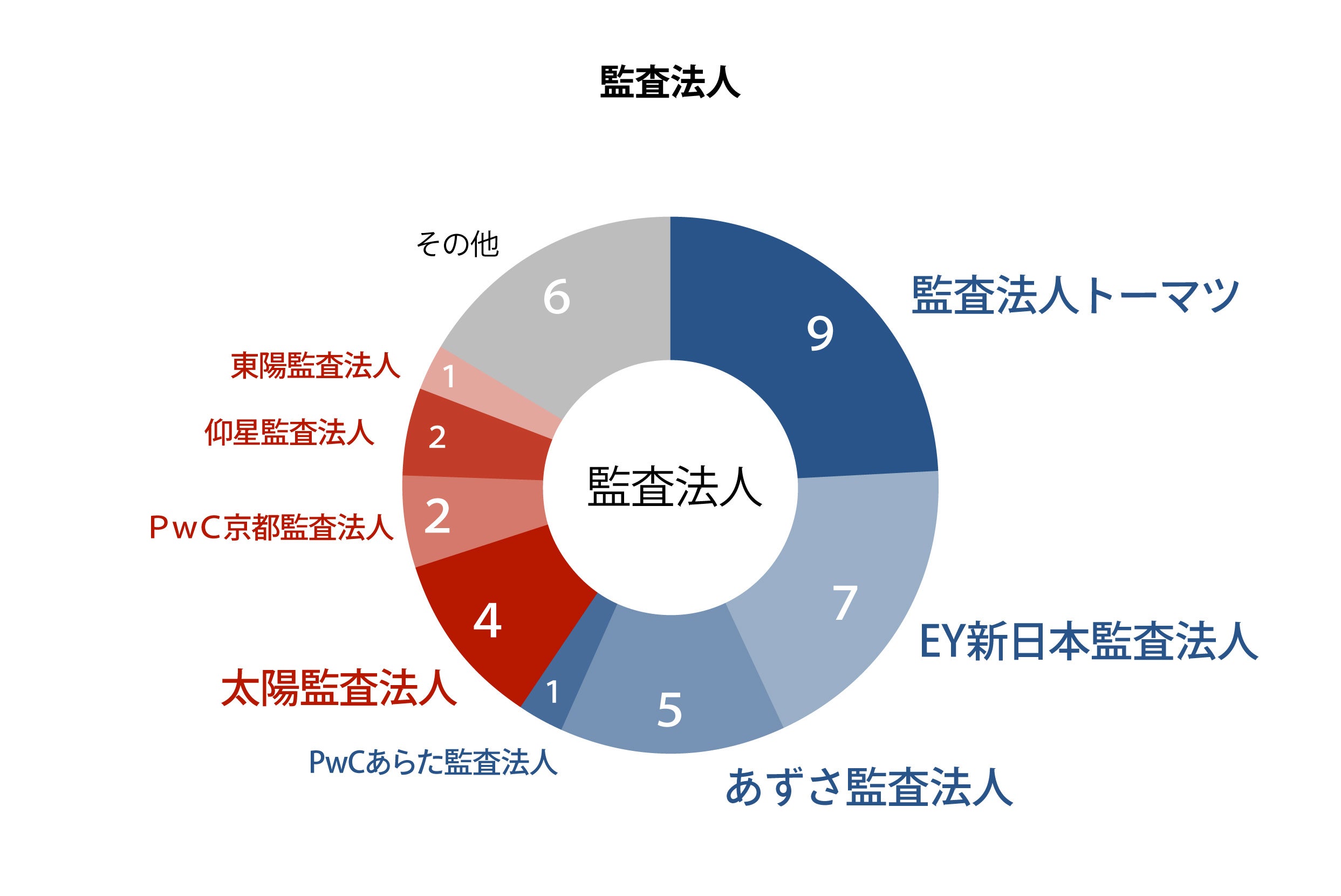 大手4社(トーマツ、EY新日本、あずさ、PwCあらた)のシェアは59.4%、準大手5社(太陽、PwC京都、仰星、東陽、三優)のシェアは24.3%、大手・準大手合わせたシェアは83.7%となりました。
