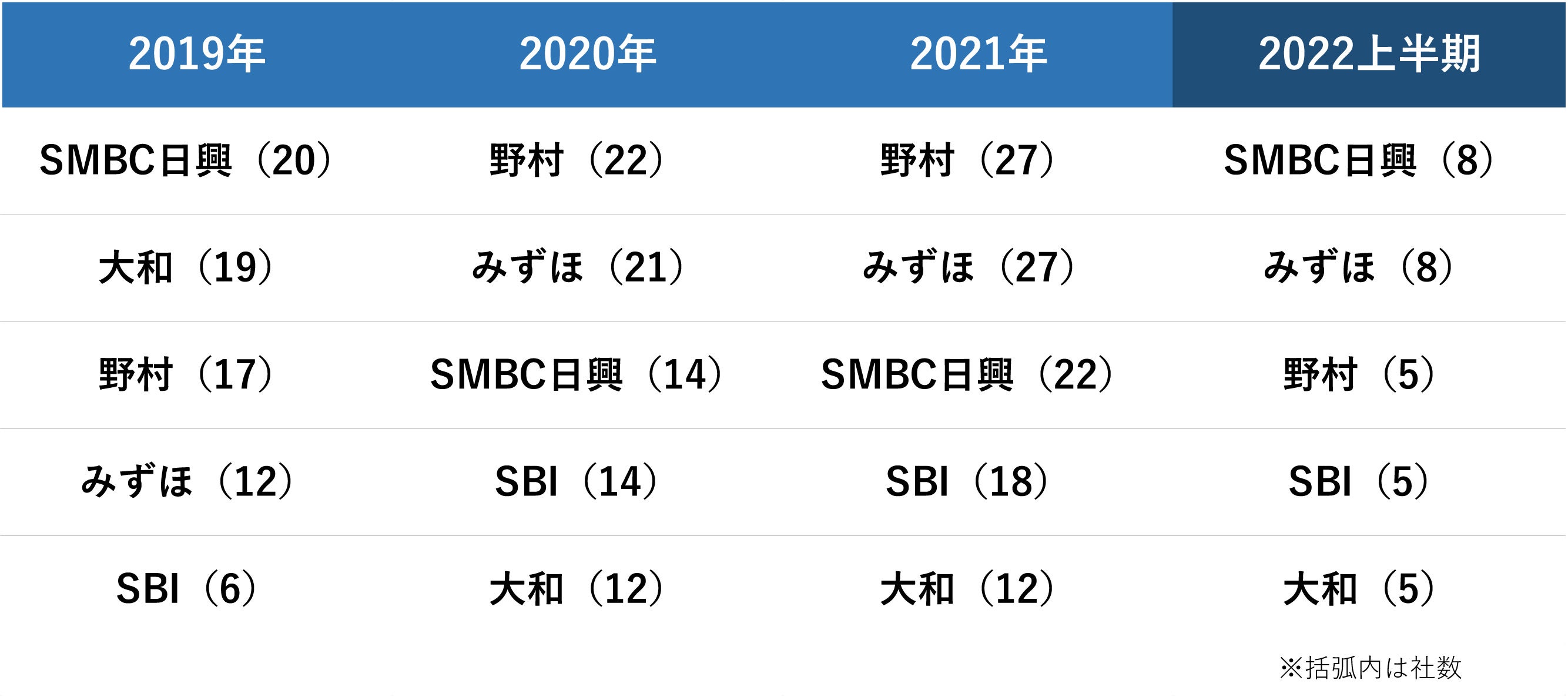 SMBC日興証券とみずほ証券がトップで並び、2020年からトップを維持してきた野村證券は第3位に後退し、大和証券、SBI証券と同位となりました。