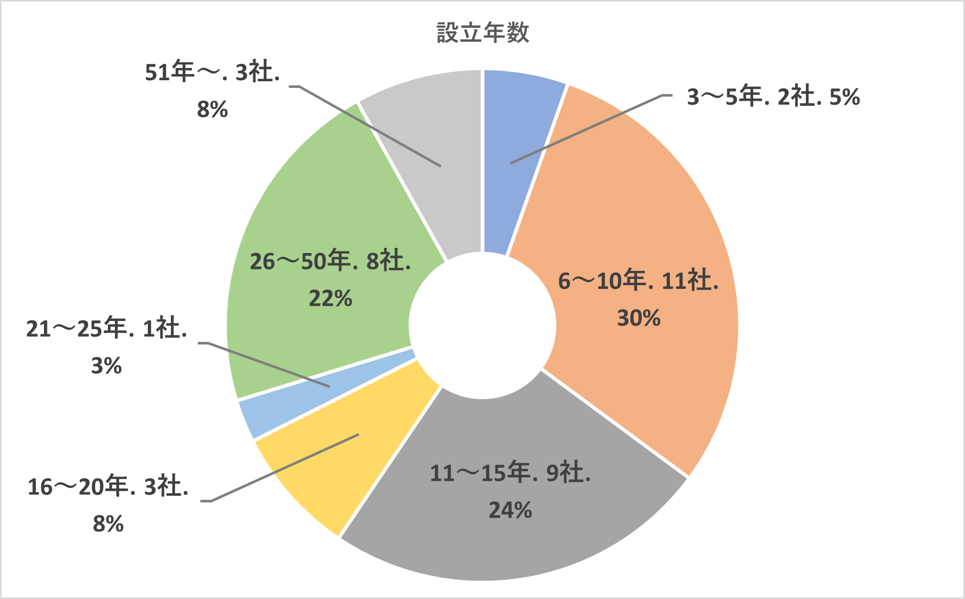設立から10年未満は13社(35%)、20年未満は25社(67%)となっています。