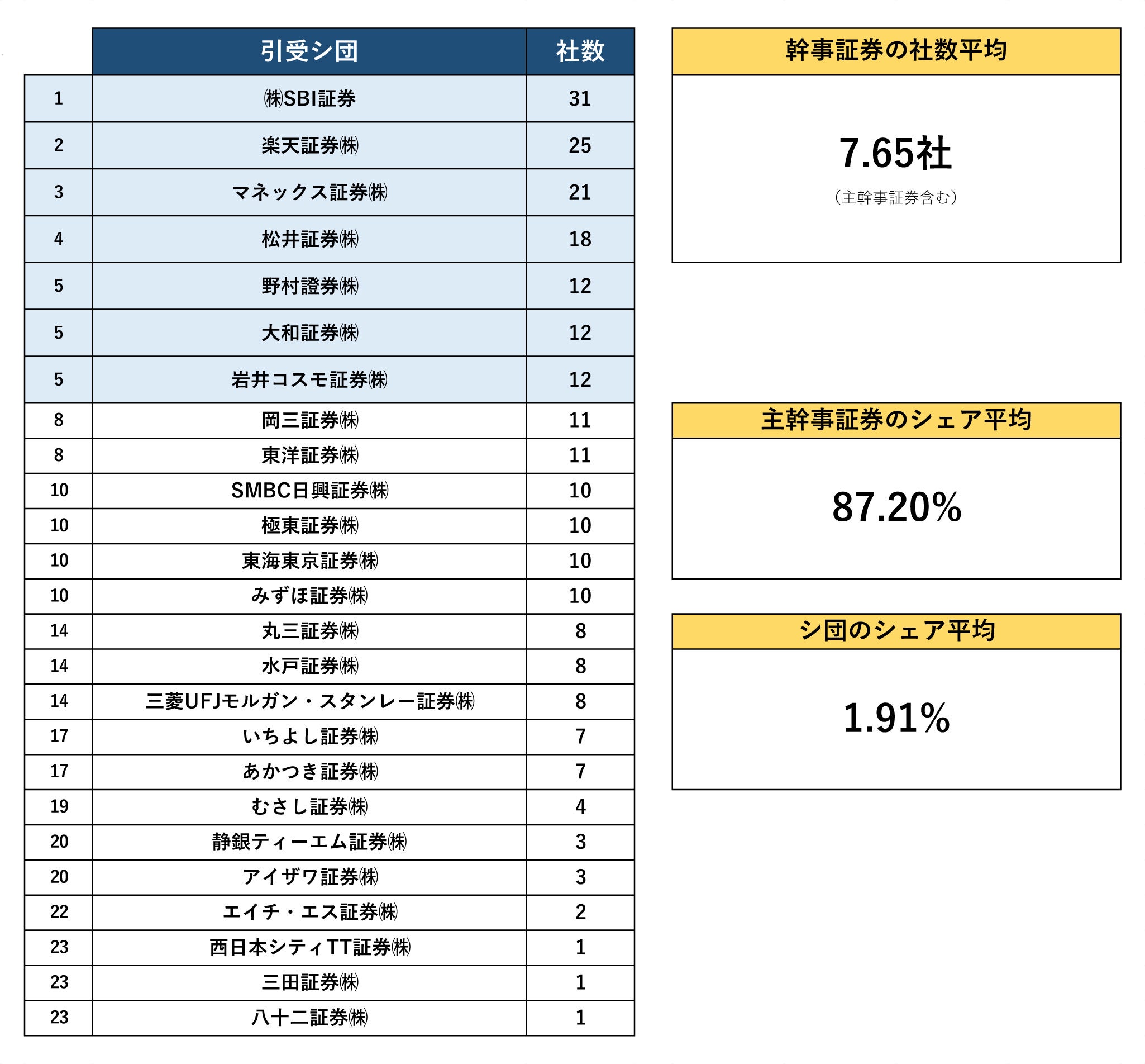 また、引受シ団のランキングでは主幹事証券で第3位のSBI証券が31社でトップとなりました。SBI証券は主幹事証券も合わせて36社(97.3%)のIPOに幹事証券として参入していることになります。