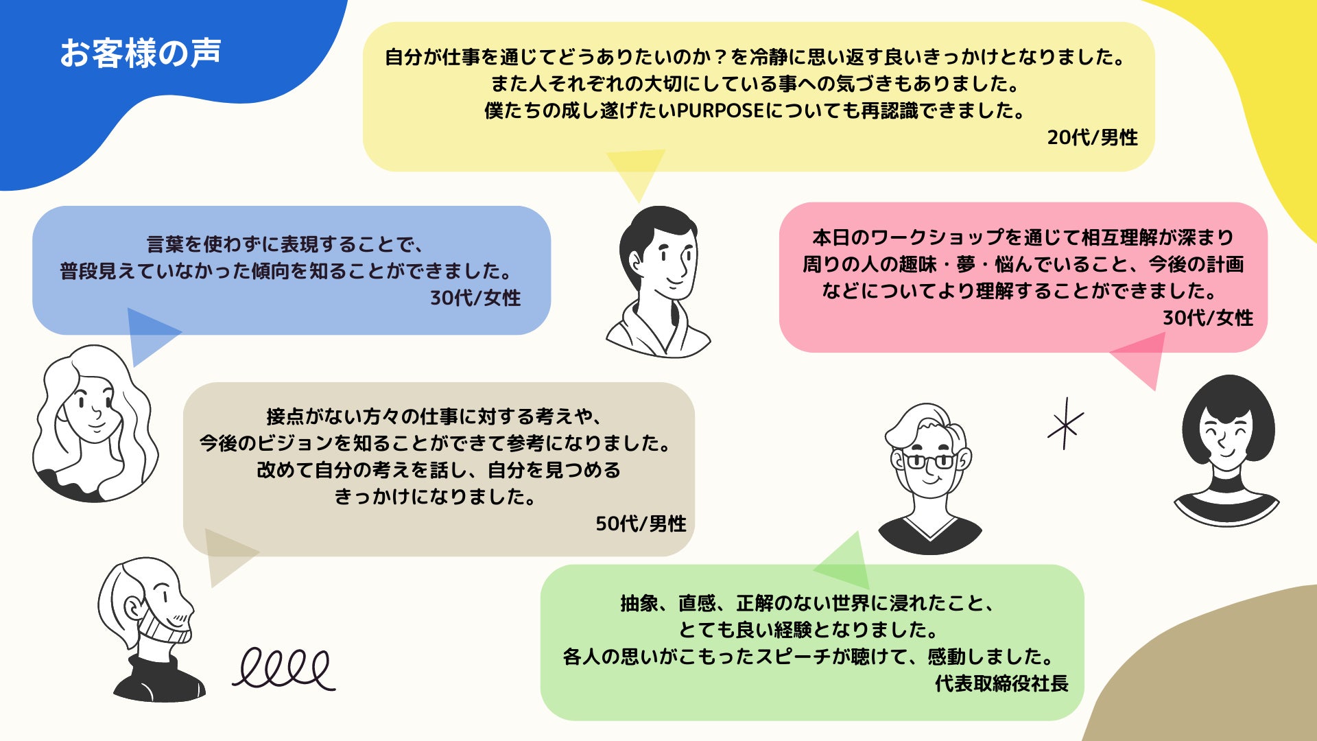 体験会は、通常3時間ほどで行う研修のエッセンスを90分にまとめ、雰囲気や進め方・心の変化を感じていただけるような構成にしております。