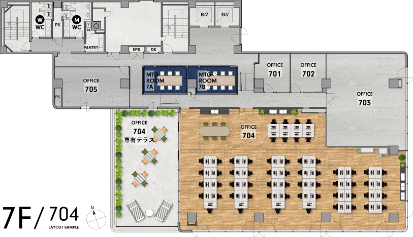 ティザーサイトにて、704号室(270.74㎡/81.90坪)を先行公開中。OAフロアの上には天然木突板タイルを敷き、天井は素地で仕上げることによって開放感を演出。90㎡の専有テラスも独占できるただ一つのプレミアム区画です。