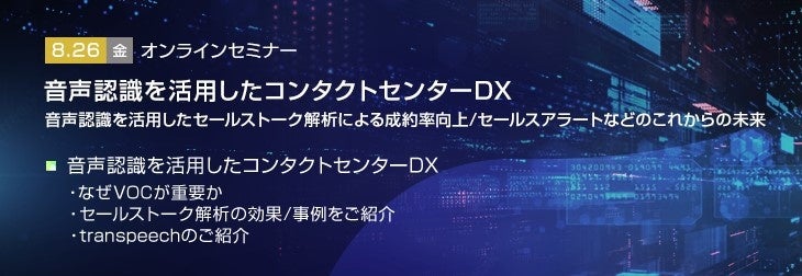 トランスコスモスではその解決策の一つとして、音声認識を活用して音声データを分析し、セールストークに活用することで成約率向上を実現しました。本セミナーでは、トランスコスモスが開発した音声認識導入から運用・分析までトータルに支援する音声認識ソリューション「transpeech」の機能をご紹介します。