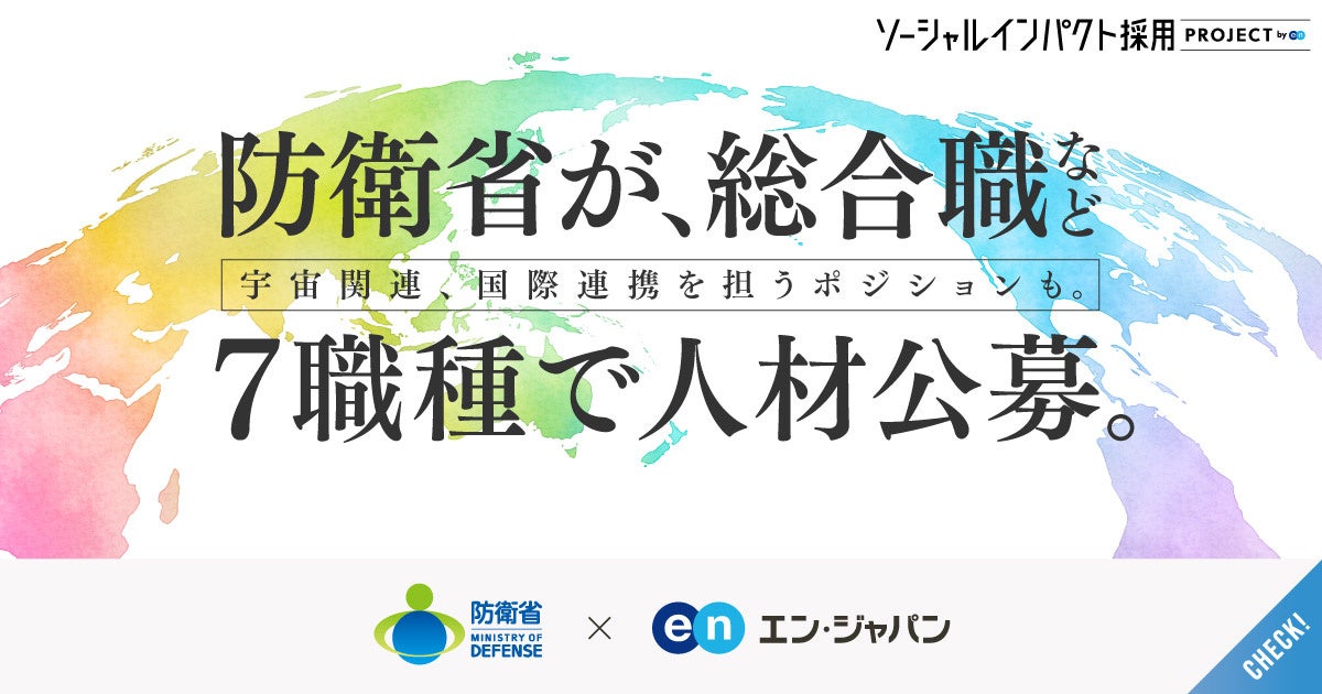 今回のプロジェクトでは7職種を一斉公募。宇宙や国際関連の専門職に加え、幹部候補のゼネラリストとして様々な役割を担う「総合職(事務系)」や、技術系の一般職員など幅広いポジションで数十名規模の採用を実施します。先行して8月7日(月)から「宇宙・海洋政策室員」「能力構築支援班員」「国際安全保障政策室員」の募集を開始。総合職と一般職は9月11日(月)に募集開始となります。「民間企業で培ってきた力を、国を守るために使いたい」という志を持つ方からのご応募をお待ちしております。