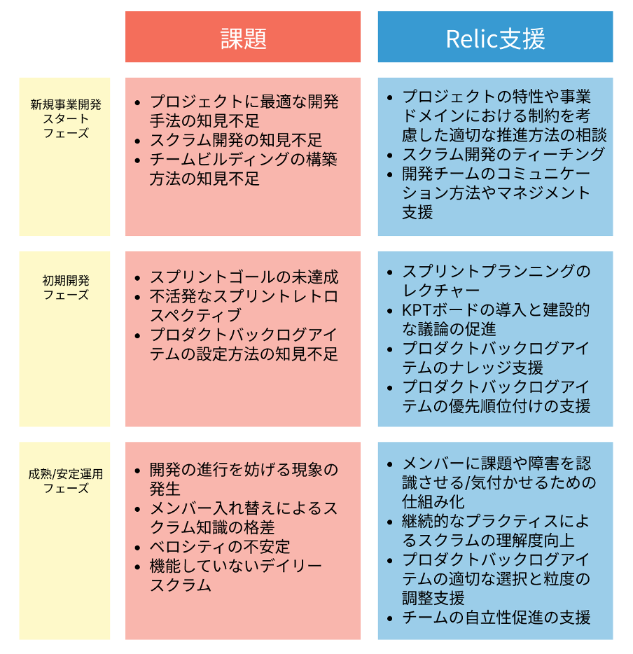 創業以来4,000社・20,000件以上の新規事業開発やイノベーション創出の支援・共創に取り組んできた実績と経験を持つRelicの人材タレントプールを活用して技術課題を支援し、サービスやプロダクトのグロースを実現します。
