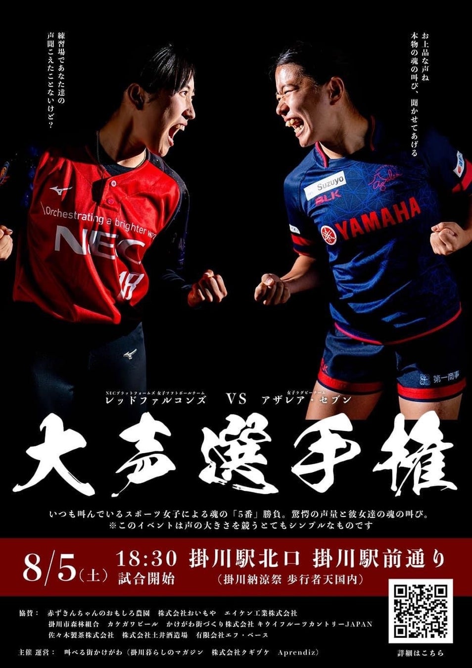 2023年8月5日(土)掛川駅前にて行われた「第四回大声選手権」にアザレア・セブンの選手5名が参戦しました。今回は大声選手権初の特別企画として、掛川市を拠点に活動する女子ソフトボールチーム『NECプラットフォームズレッドファルコンズ』との5番勝負。スポーツ女子の悩み、感謝、恋愛事情、目標などお題に沿って叫び、「叫べる街、かけがわ」をアピールしました。