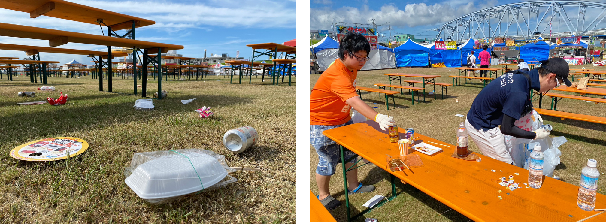 徳島県の一大イベント『吉野川フェスティバル2023』の会場で行われた徳島 STAGE。前日の花火大会で屋台が並ぶなか多くの見物客が訪れたこともあり、会場には空き缶やペットボトル、プラスチック容器や割り箸などのごみが大量に捨てられています。