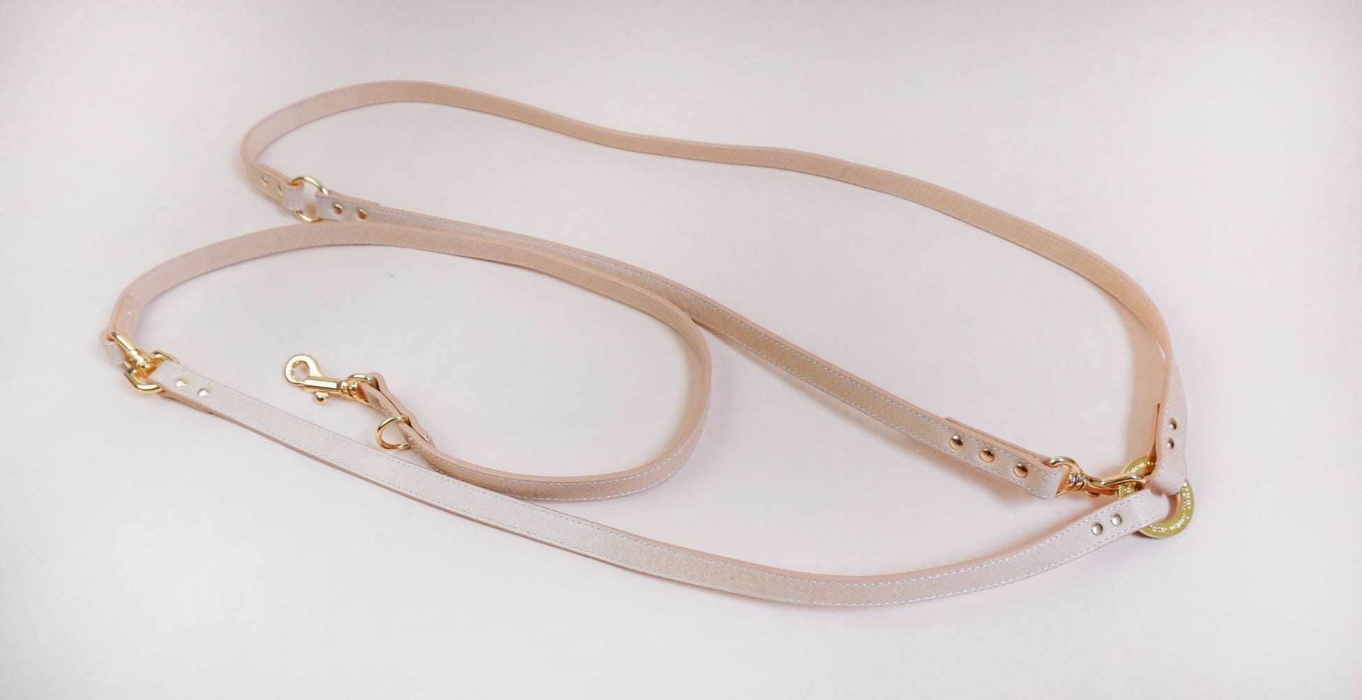 留め具部分の良質な真鍮(金属)やフープ状のブランド名が刻印されている金具など、細部のディティールは美しく高貴な印象を与えてくれます。Dカンやリング部分に引っかけることで、4つの異なる長さに調整でき、場面に応じてお好みの長さでお使いいただくことができます。