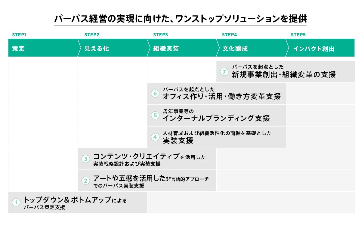 トップダウンでの発信が主流であるパーパス経営に、ボトムアップ起点のアプローチを加えることで、社内への浸透や実装の度合いを高めていきます。また、アートや五感を活用した非言語的アプローチを用いて、言語では表しづらい社員一人ひとりのインサイト(潜在意識)も顕在化します。これらのアプローチを組み合わせて、確かな企業変革の実現を目指します。