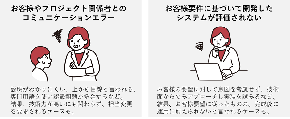 ハードスキルに偏重した結果、多くのITプロジェクトでは、お客様やプロジェクト関係者とのコミュニケーションエラーやお客様の要望通りに開発したシステムが評価されない事象が日々起こってしまっています。