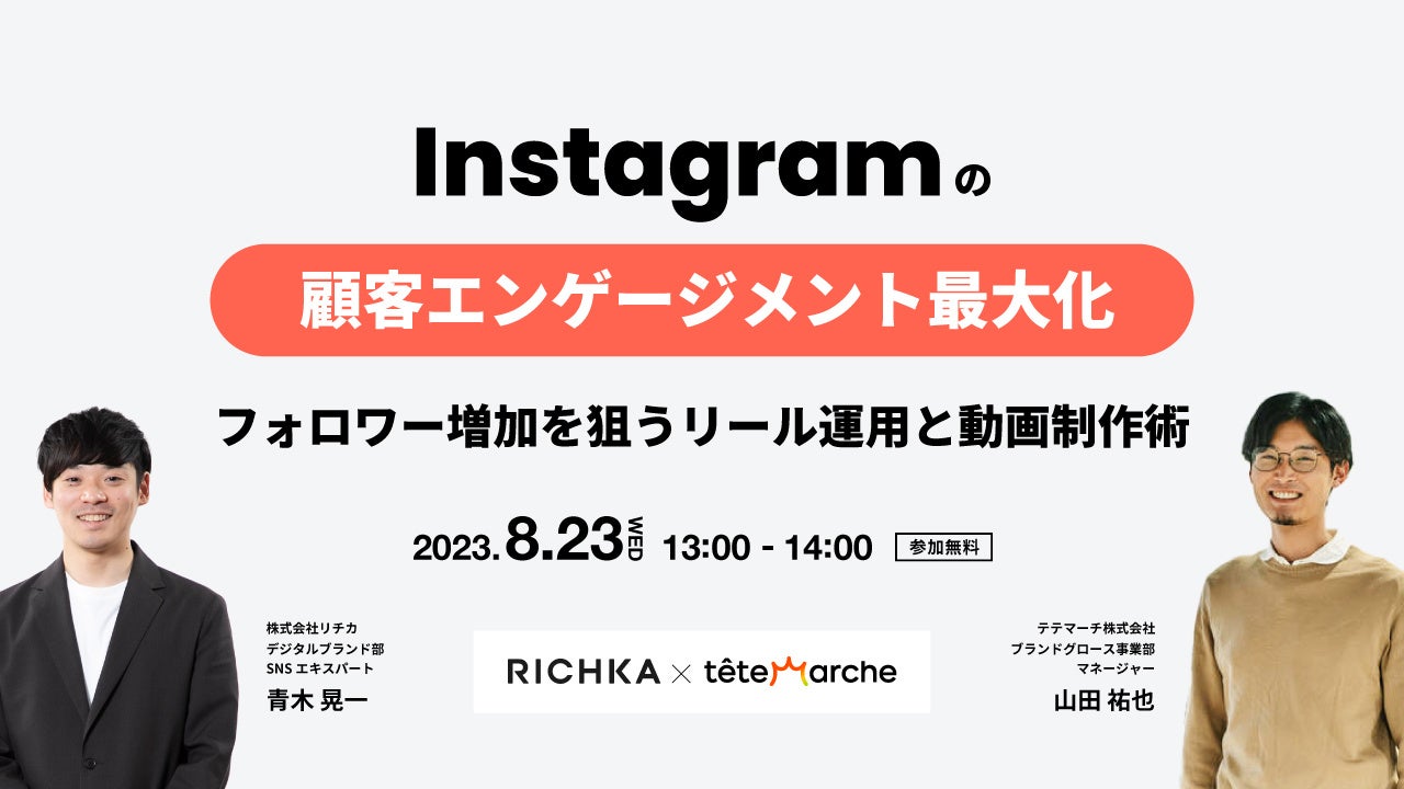 株式会社リチカ(本社:東京都渋谷区、代表取締役:松尾幸治 以下、当社)は、テテマーチ株式会社(本社:東京都目黒区、代表取締役:上田大介 以下、テテマーチ)と「Instagramの顧客エンゲージメント最大化~フォロワー増加を狙うリール運用と動画制作術~」共催セミナーを8月23日に開催します。