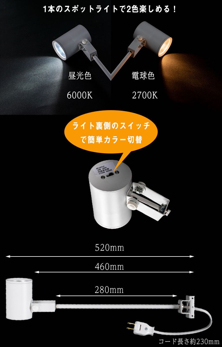 今回ご紹介させて頂きます【LEDアームスポット】は一体型でダクトレールも不要、1台で2色(電球色/昼光色)の切替が出来る優れものです。シンプルで使い勝手もよいので設置・後片付けと、より効率的に仕事が捗ります。