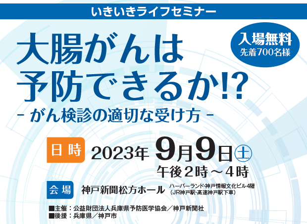 兵庫県予防医学協会と神戸新聞社は、2023年9月9日(土)午後2時から「いきいきライフセミナー」を神戸新聞松方ホール(〒650-0044 神戸市中央区東川崎町1-5-7)で開催します。