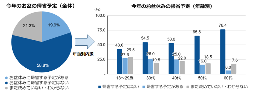 ・全回答の中で「帰省する予定はない」と回答した人が最も多く58.8%、次いで「まだ決めていない・わからない」が多く21.3%、最も低かったのは「帰省する予定がある」の19.9%となりました(下図左参照)。