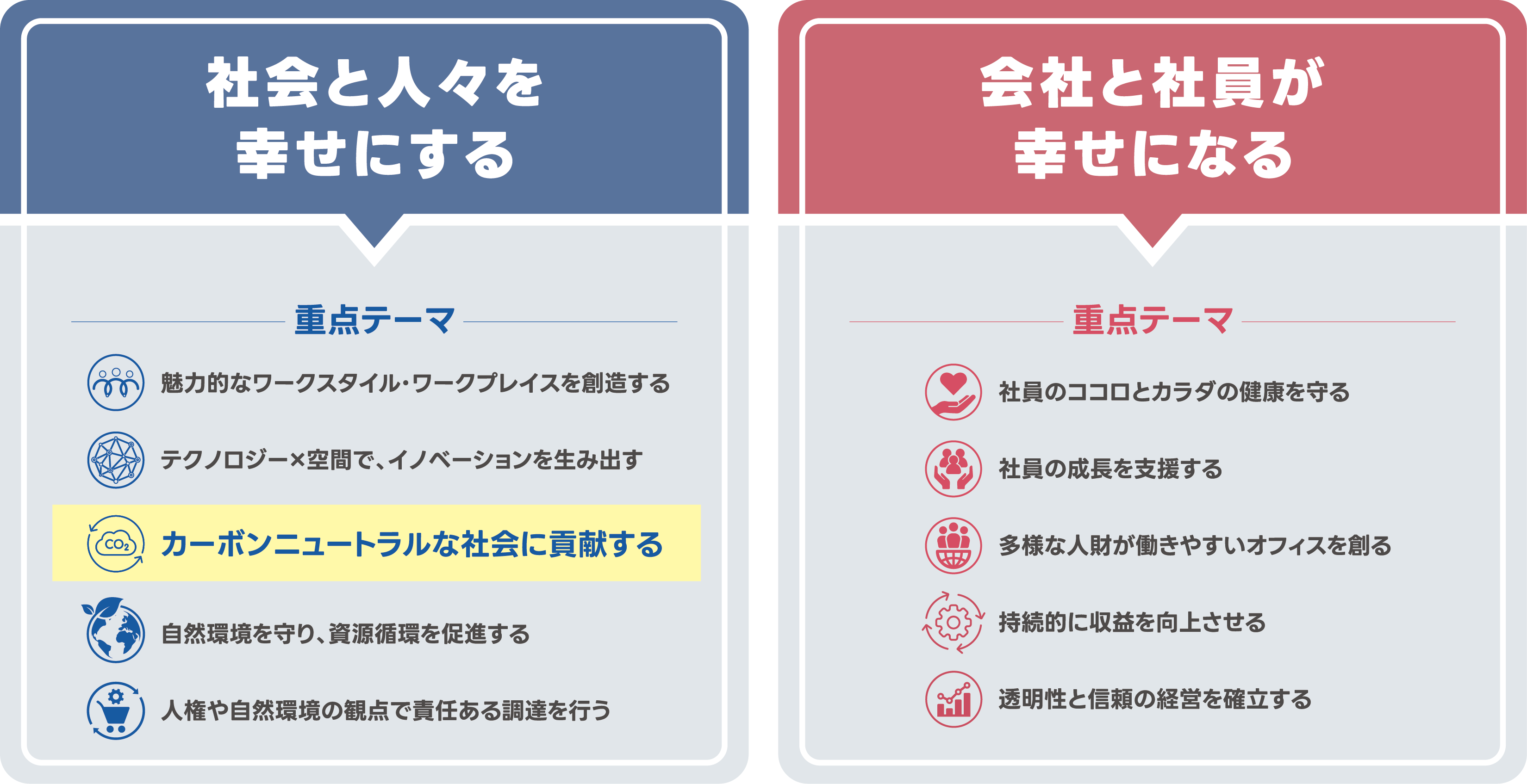 イトーキでは、「働く」場を取り巻くさまざまな課題を解決し、「社会と人々を幸せにする」「会社と社員が幸せになる」ことを実現するために、事業環境がもたらすリスクと機会を分析して、マテリアリティ(重要課題)を定めています。これらのマテリアリティを軸に事業活動を推進し、社会課題を解決することで、持続的な社会と企業の成長につなげていきます。