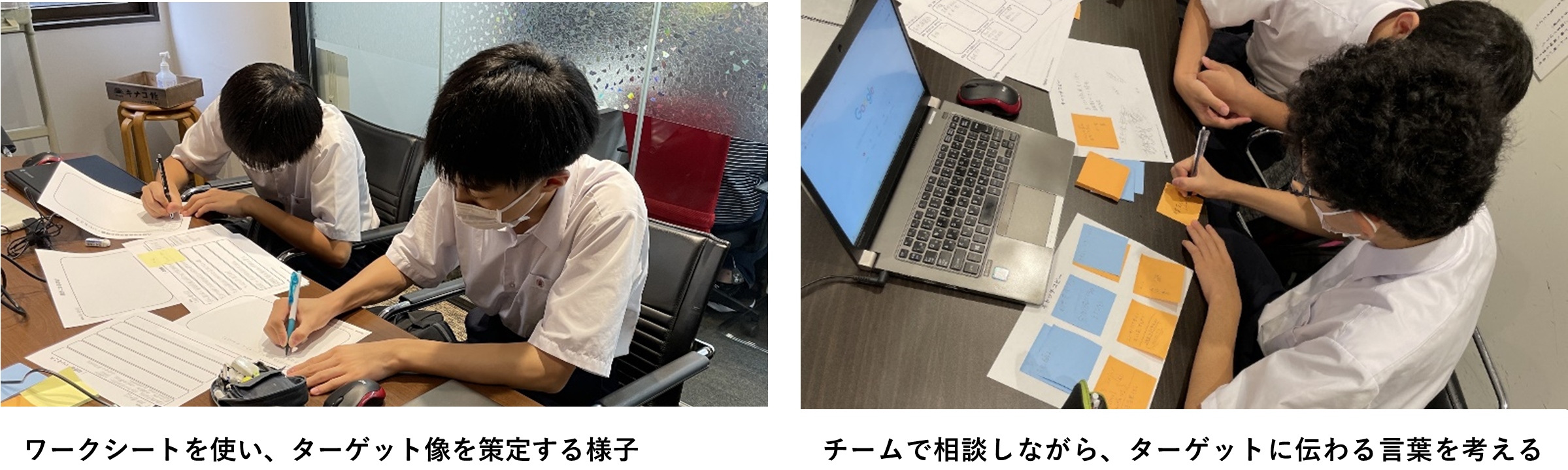 当日は、ブランディングを学ぶ講義とワークショップを実施。ワークショップでは、2チームに分かれ「受検生が九段中等を受検したくなるキャッチコピーづくり」を体験してもらいました。