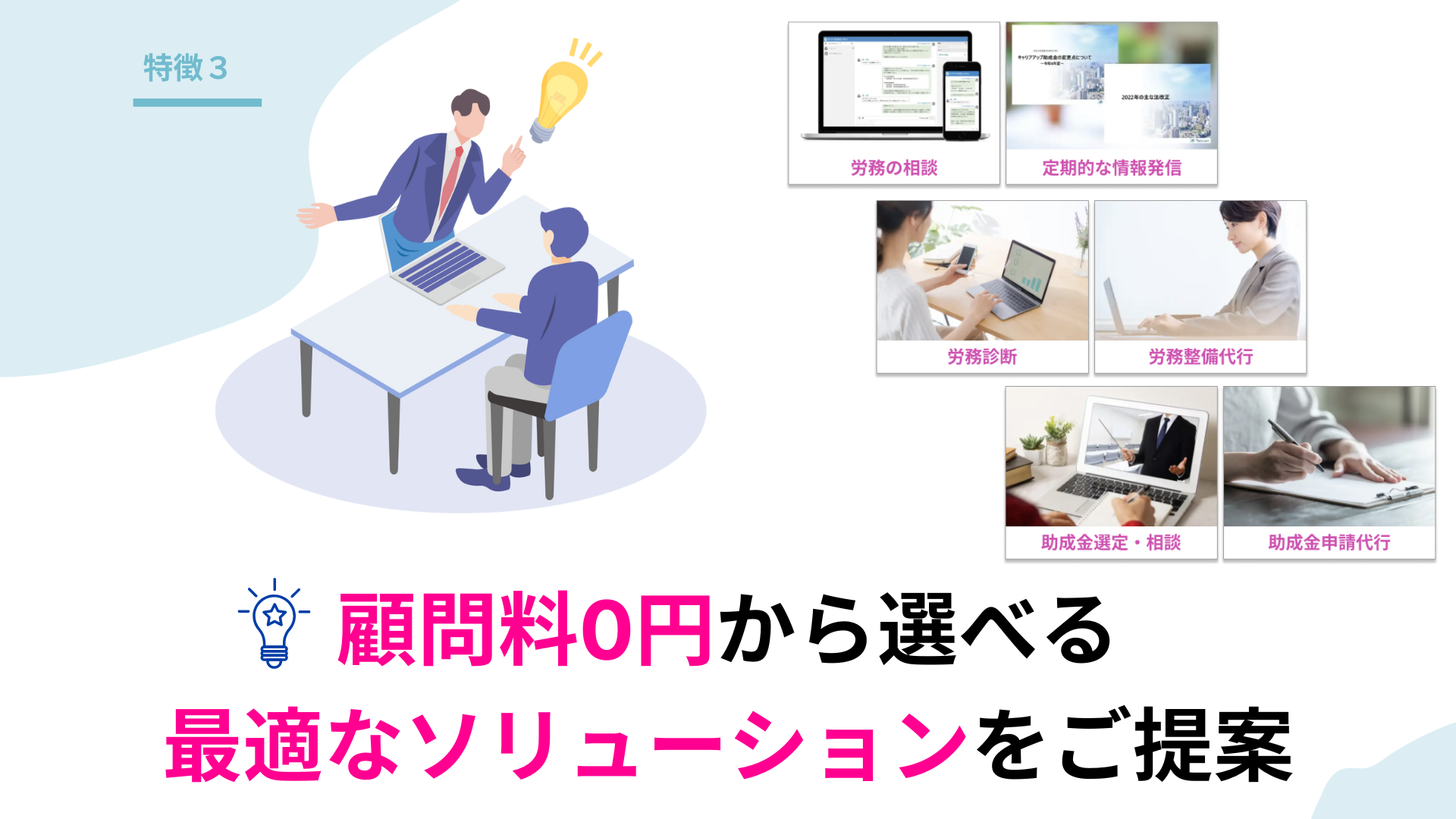 オンラインチャットで “ちょっと相談”した上で、例えば、新しく規程作成・届出・助成金活用等が必要性が出てきた場合には、最適かつ最安値でご利用いただけるプランをご提案します。