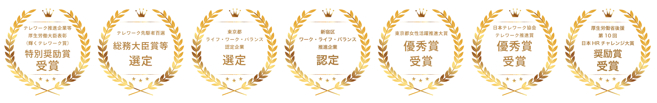 *厚生労働省『輝くテレワーク賞』特別奨励賞、総務省『テレワーク先駆者百選』、東京都『東京ライフワークバランス認定企業』、東京都『東京都女性活躍推進大賞』優秀賞などを受賞・選出・認定