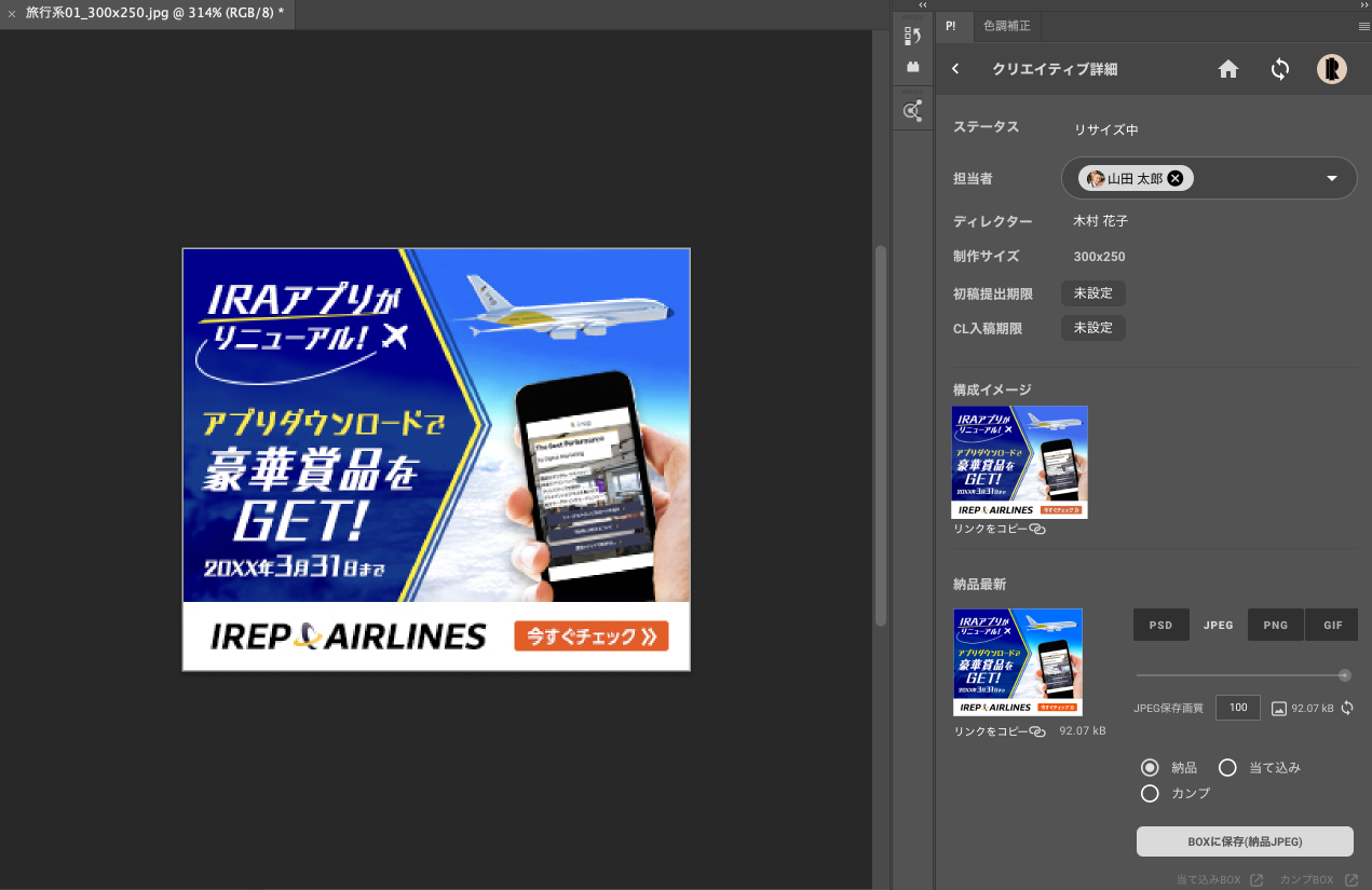 PINGPONGはWebアプリケーションとしてだけでなく、Adobe Creative Cloudのプラグイン機能も備えています。例えば静止画広告作成の場合、デザイナーが利用するAdobe PhotoshopにPINGPONGがプラグインとしてインプリメントされるため、デザイナーはアプリを切り替えることなく、Photoshop上でPINGPONGのクラウドストレージ保存やSlack連携によるレビュー機能などが利用可能です。