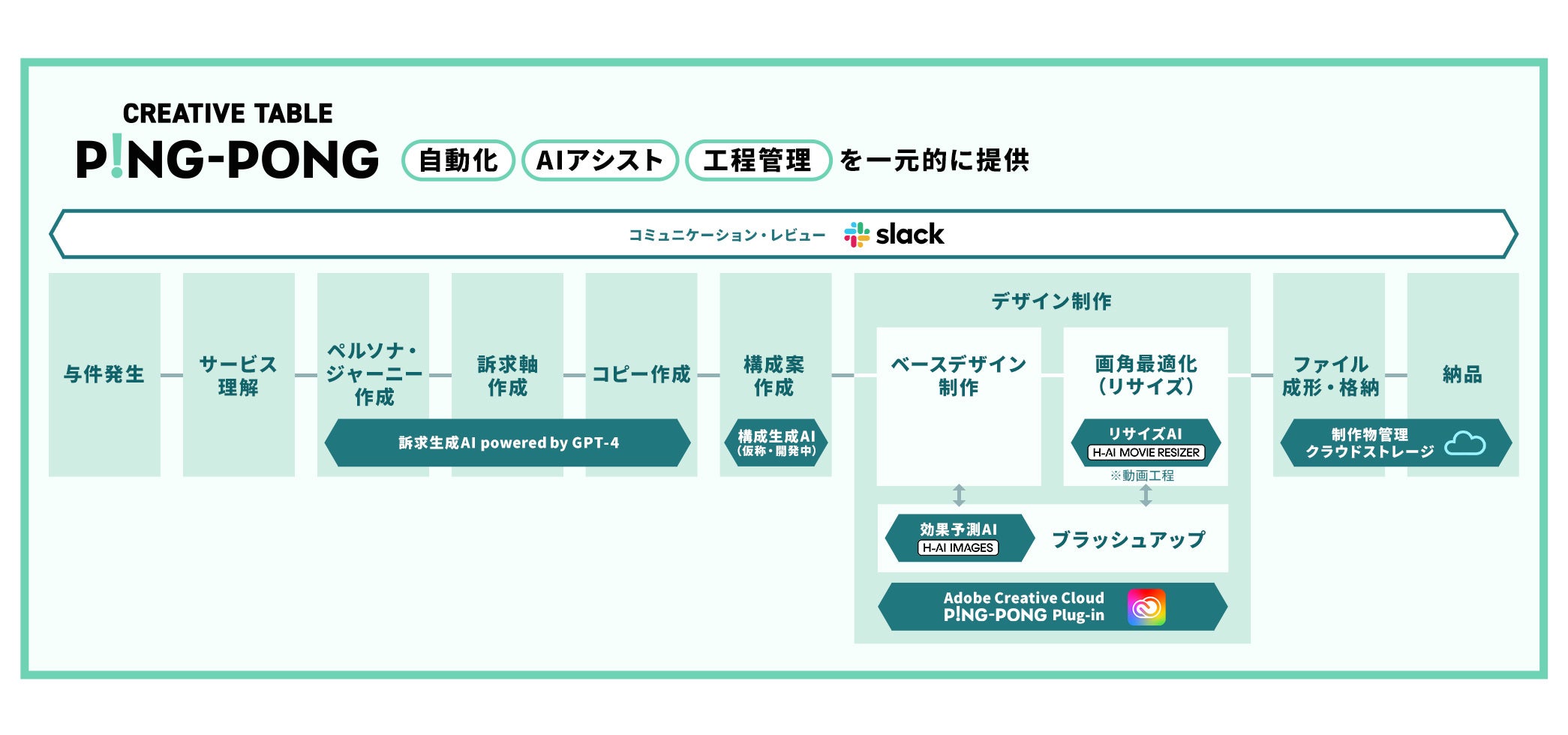 PINGPONGは運用型広告のクリエイティブ制作に特化したAIワークフローシステムです。「制作工程管理機能」と「AI制作アシスト機能」によって、ワークフローをハイパーオートメーション化し、管理・制作工数の削減とデザイナーのクリエイティブ力の向上を目指します。