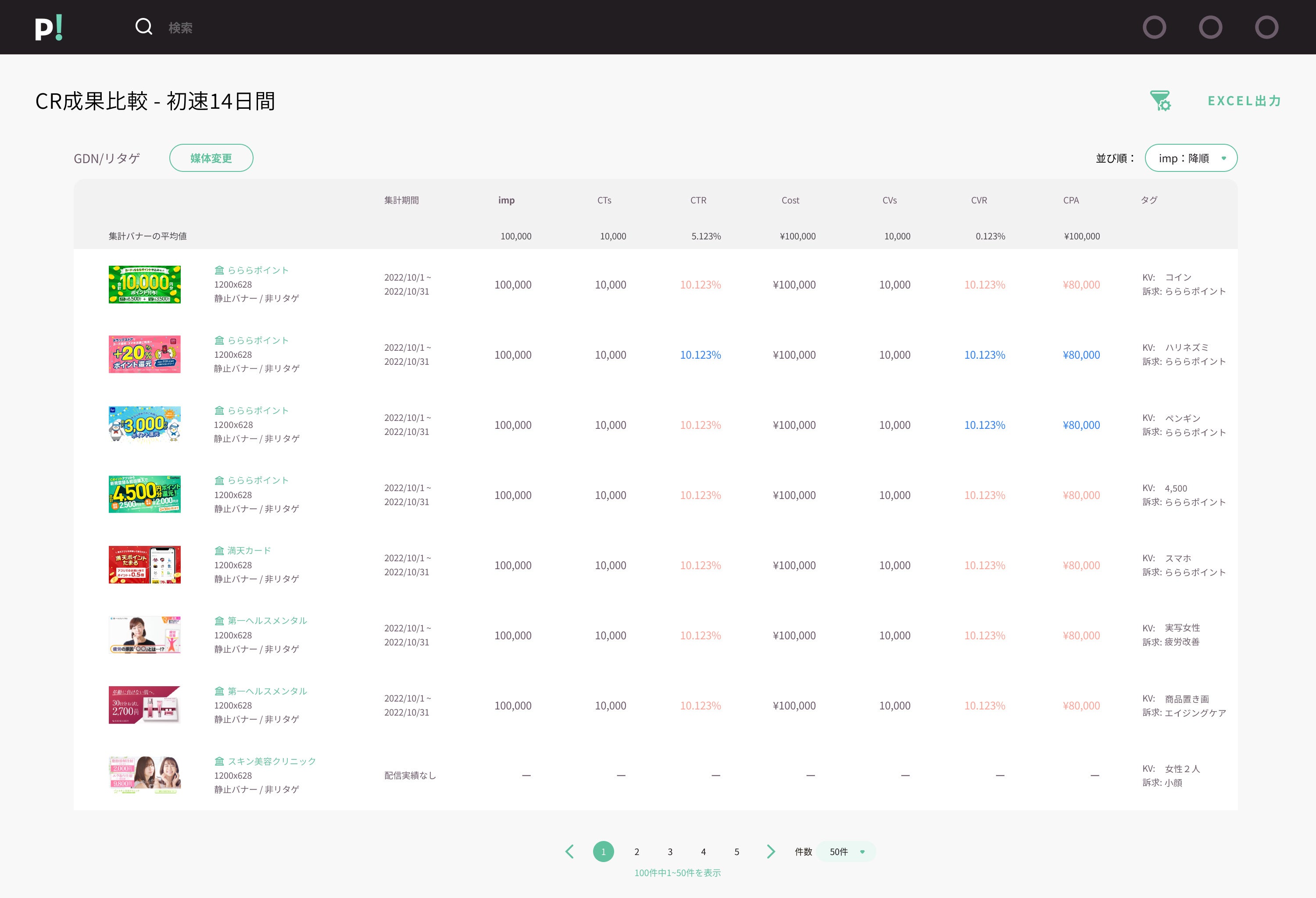 制作した広告クリエイティブを広告配信データと結びつけることにより、デザイナーがいつでも制作物の成果を確認することができます。デザイナーが常に「勝ちクリエイティブ」を把握することで、制作時のクリエイティブ力の向上に寄与します。