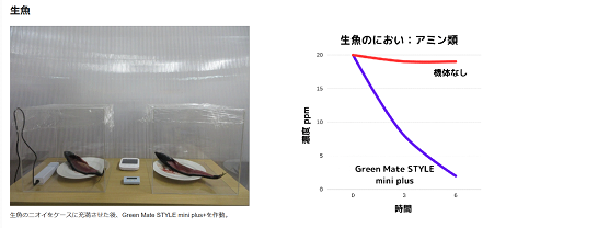 下の実験を見ていただきましょう。夏場などに特に気になる生ゴミなど食べ物のニオイ、これに対する効果を確認すべく生魚を使って実験してみました。