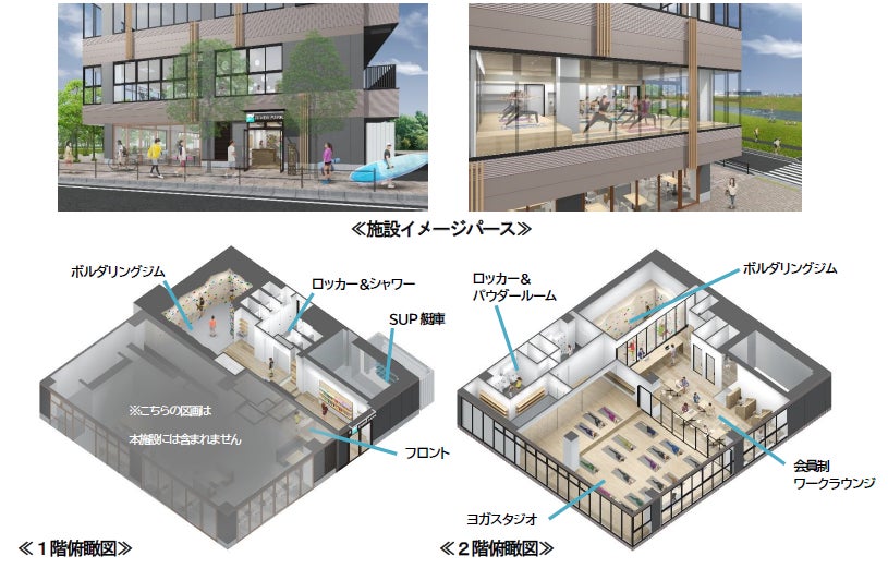 本施設内には、多摩川を望む圧倒的な開放感があるヨガスタジオや様々な熟練度の方に対応したボルダリングジムを設置します。また、施設内外から素早くアクセスできて、且つランニングステーションとしても利用できるロッカー&シャワーのほか、仕事や読書、会員間のコミュニケーションなどにご利用いただける会員制ワークラウンジを併設します。
