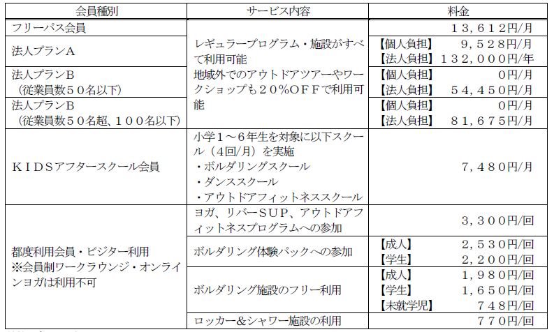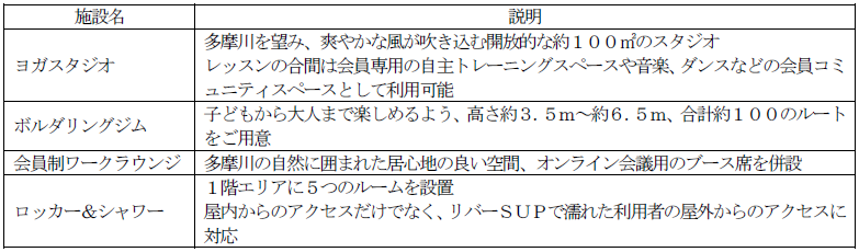 本施設内には、多摩川を望む圧倒的な開放感があるヨガスタジオや様々な熟練度の方に対応したボルダリングジムを設置します。また、施設内外から素早くアクセスできて、且つランニングステーションとしても利用できるロッカー&シャワーのほか、仕事や読書、会員間のコミュニケーションなどにご利用いただける会員制ワークラウンジを併設します。