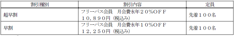 通常フリーパス会員の月会費13,612円(税込み)が以下の価格で永年割引となります。