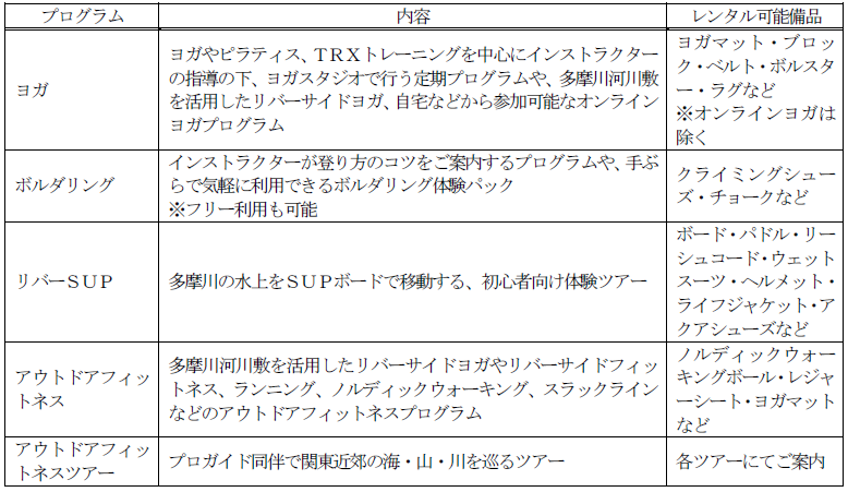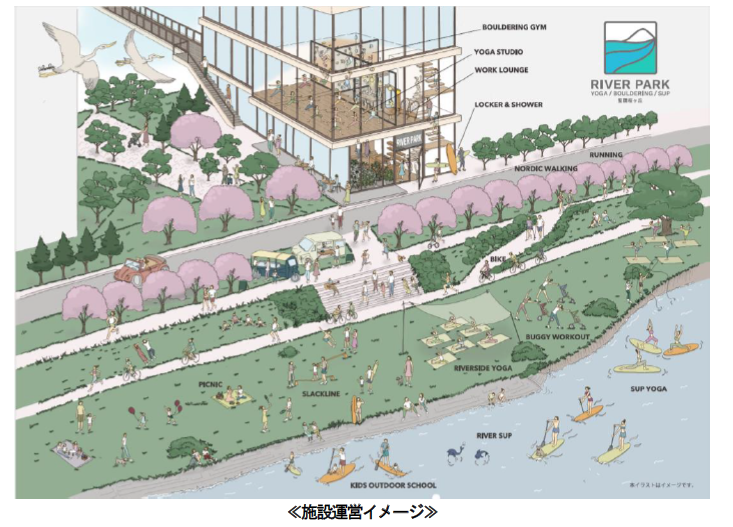 「RIVER PARK 聖蹟桜ヶ丘」は、ヨガやボルダリング、TRXトレーニング(注)などのインドアプログラムに加え、リバーSUPやリバーサイドヨガなど、多摩川の自然資源を活用したアウトドアプログラムを専門のインストラクターの下で楽しむことができる会員制のアウトドアフィットネスクラブです。