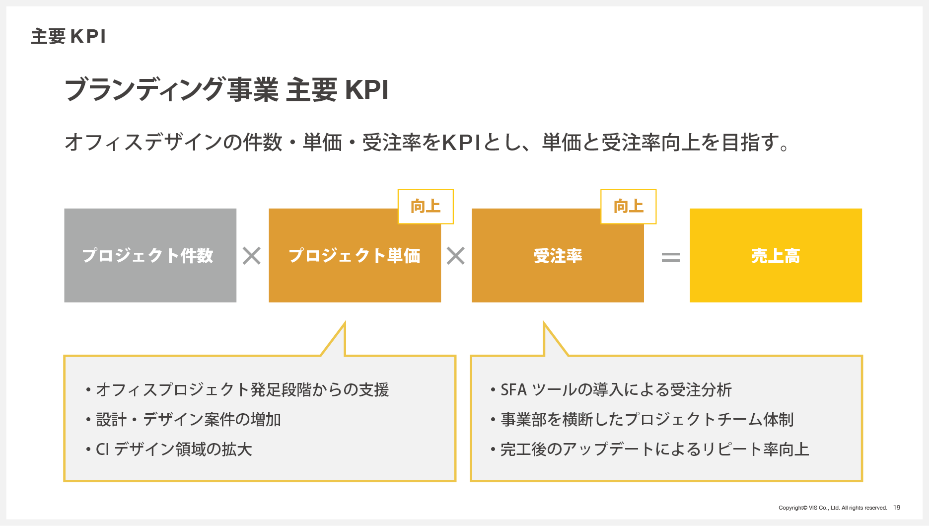 オフィスデザインの件数・単価・受注率をKPIとし、単価と受注率向上を目指します。