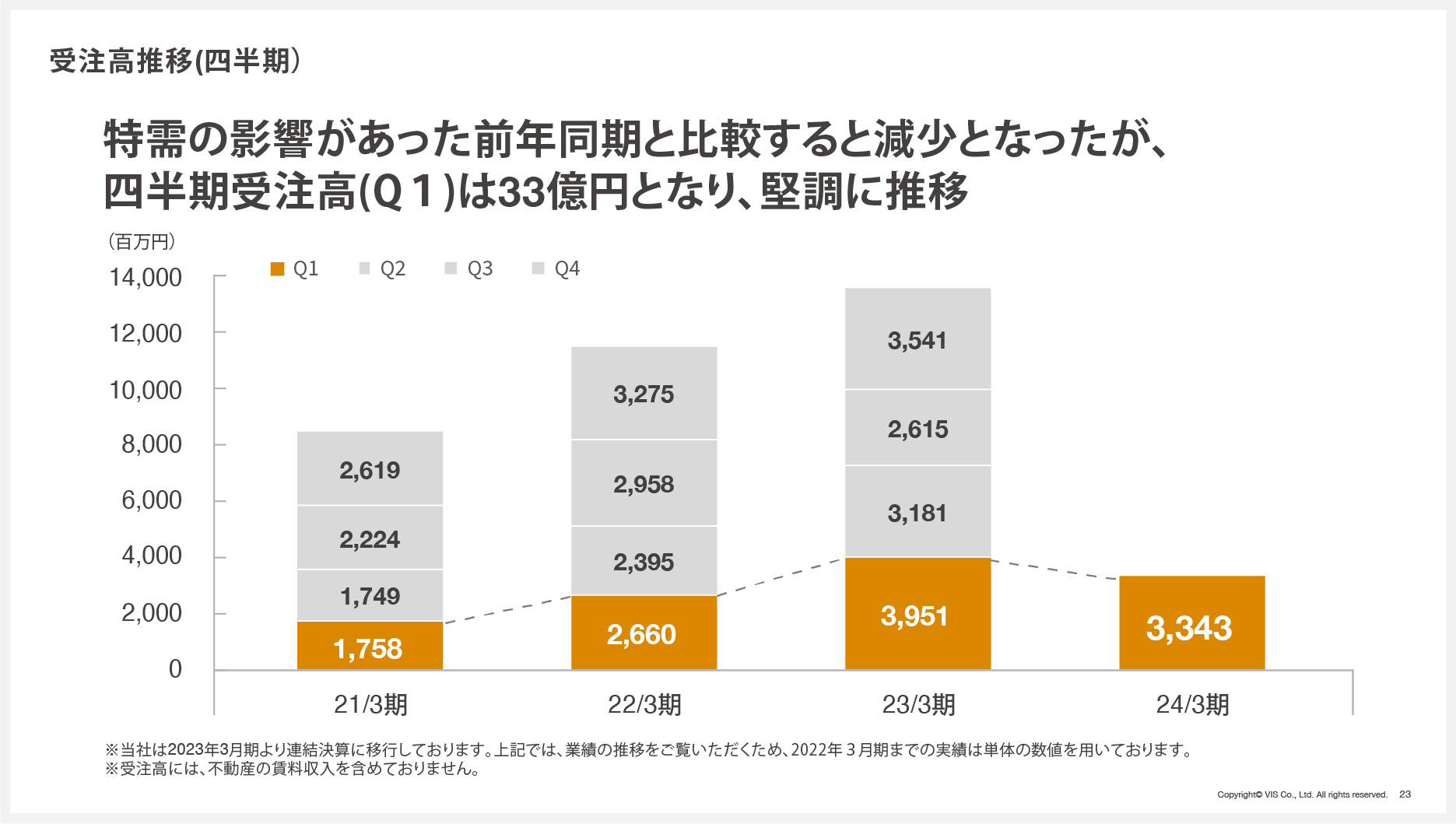 特需の影響があった前年同期と比較すると減少となりましたが、四半期受注高(Q1)は33億円となり、堅調に推移しています。