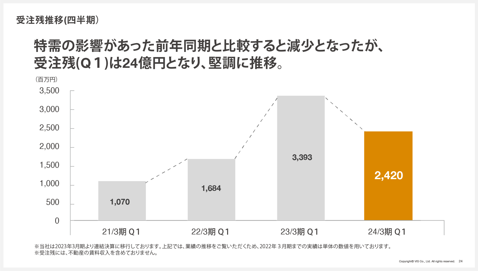 特需の影響があった前年同期と比較すると減少となりましたが、受注残(Q1)は24億円となり、堅調に推移しています。