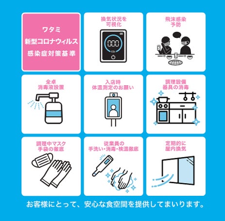 ワタミでは、首都圏や大阪など、各自治体が示している感染拡大防止のガイドラインの基準を満たしてはおりますが、独自の新型コロナウイルス感染防止対策として「ワタミ安心宣言」という高い感染防止基準を設定することで、お客様・従業員ともに安心できる環境整備に努めてまいります。