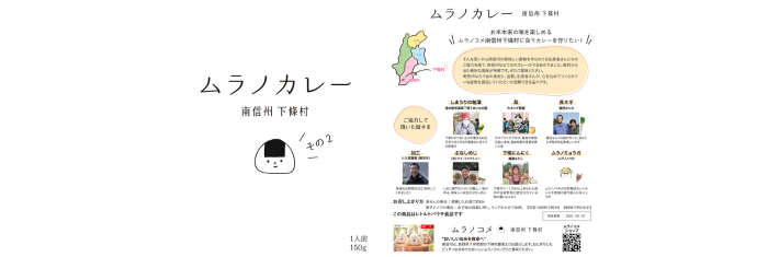 今回発売する『ムラノカレー その2』は、南信州の伝統野菜「しまうり」の粕漬をはじめ、「梨」、「長ネギ」、「しめじ」、「下條にんにく」、「みょうが」の6つの食材が入った、自然豊かな下條村を丸ごと堪能できる満足度の高いカレーに仕上げました。