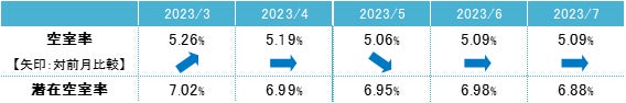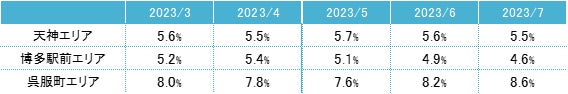 空室率は前月から横ばいの5.09%となった。空室を抱えた新築ビルが竣工した一方、昨年から今年にかけて竣工した大規模ビルを中心に成約した。規模別では「中型」が前月比プラス0.5ポイントの大幅な上昇となり、2022年2月以来の7%台となっている。潜在空室率は前月比マイナス0.10ポイントの6.88%だった。再開発は天神エリアに続き、博多駅周辺でも本格化している。博多駅周辺では将来の建替えを見据え、契約更新がない定期借家契約を条件とするビルが増えている。