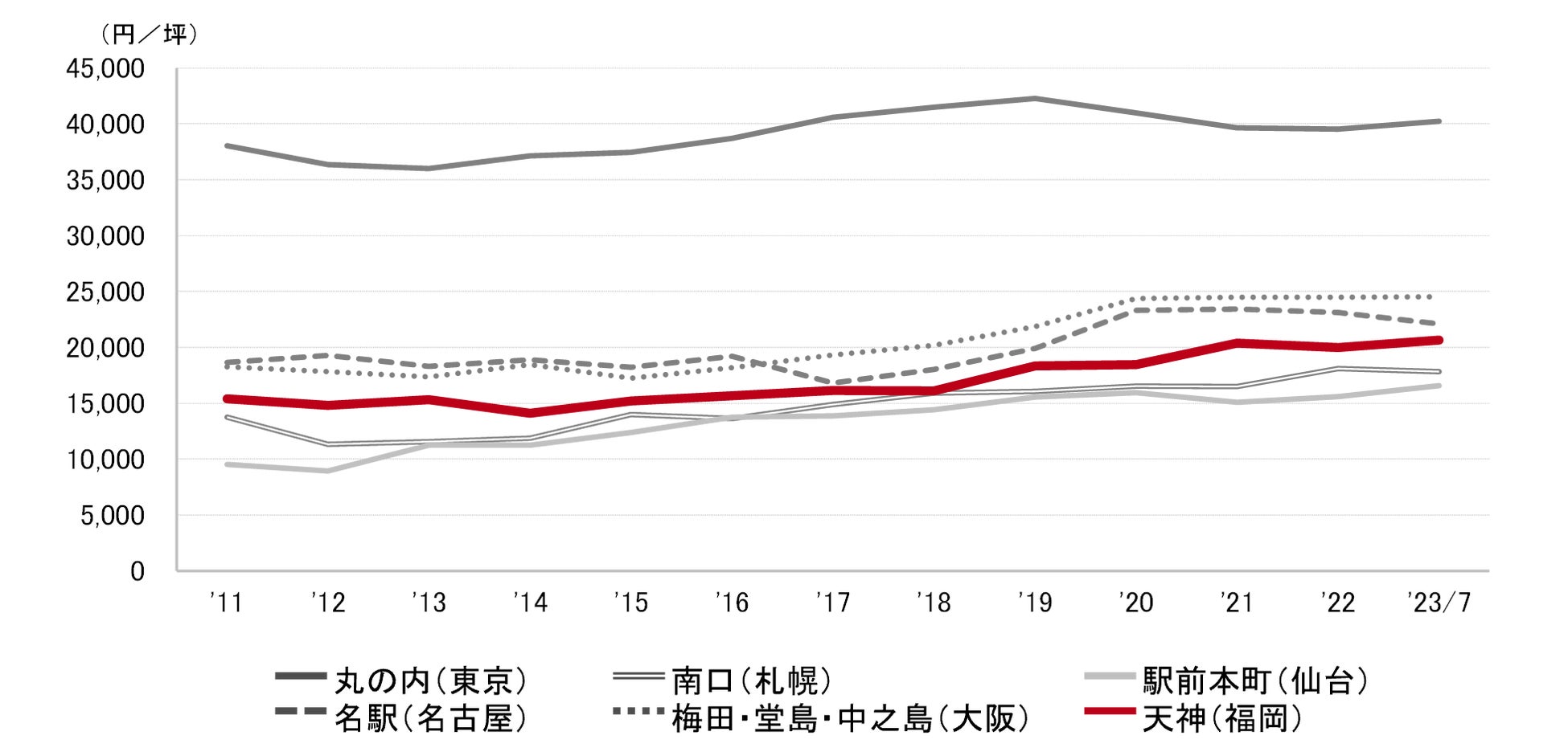 昨年から今年にかけて、博多駅周辺は新規供給が続いたが、概ね順調にテナント誘致が進んでいる。ビルグレードの改善を目的とする移転や集約を伴う立地改善等の需要を取り込んでおり、採用活動における優位性の確保を重視するテナントも多い。建替えに伴う需要も底堅く、博多駅周辺のオフィス需要は今後も活発な状況が続くとみられる。(福岡支店長 中村竜治)